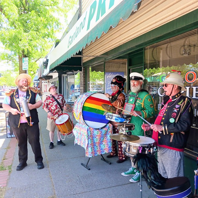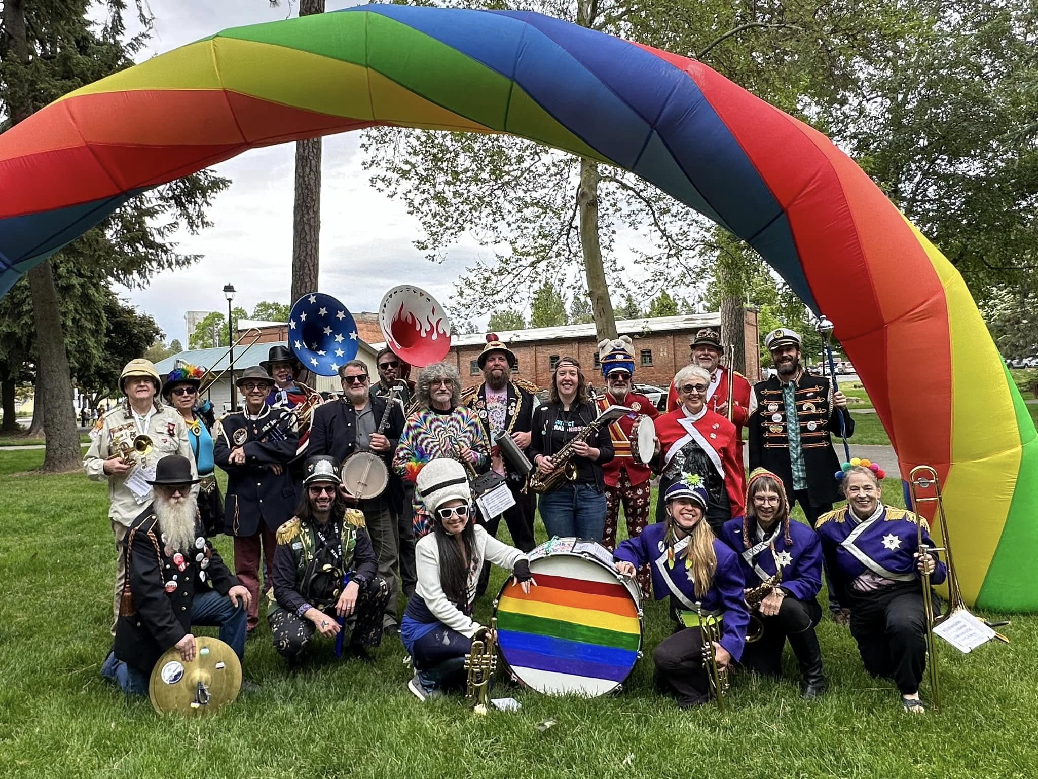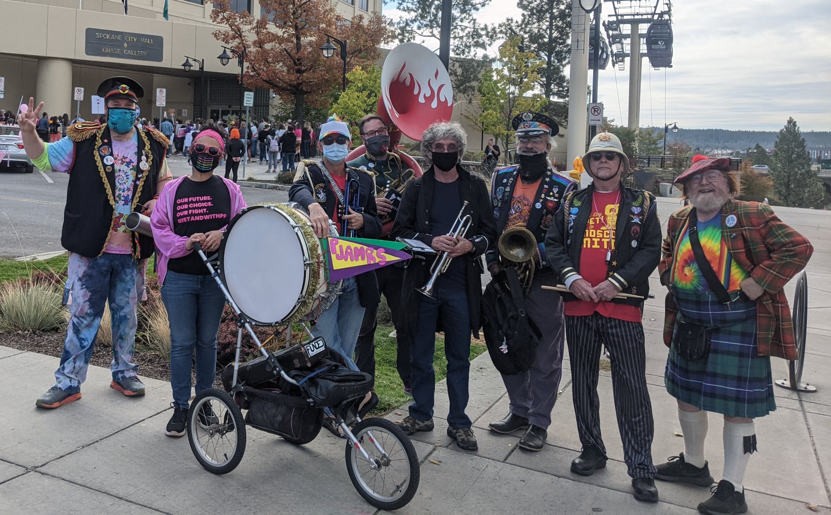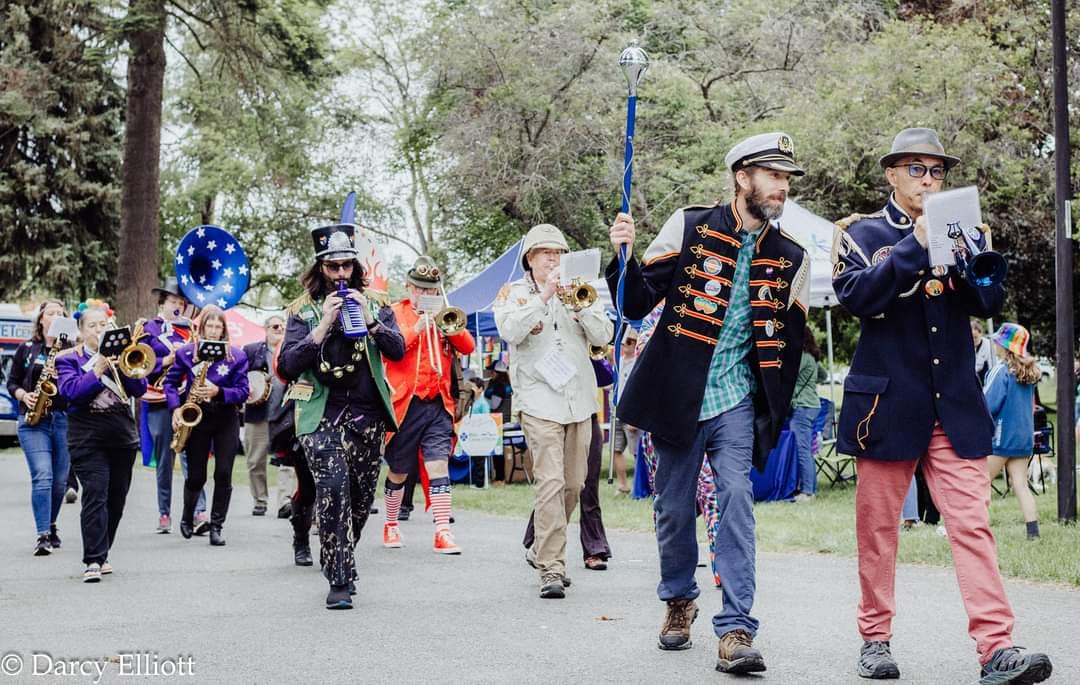 A community marching band, the P-Jammers, or PJAMRS (Peace and Justice Activist Musical Rascals of Spokane) are part of the international HONK! movement (See honkfest.org for more info). As such, membership is open to musicians of all levels and people who want to find a positive way to plug in with an emphasis on fun and doing the right thing. The PJAMRS are a multiple award winning (1st place in Southeast Spokane County Fair, 1st Place at Bloomsday 2024), and official Bloomsday band, that play at public celebrations, marches and rallies, or just for the heck of it. If you are interested in joining, just reach out to us on our Facebook page!